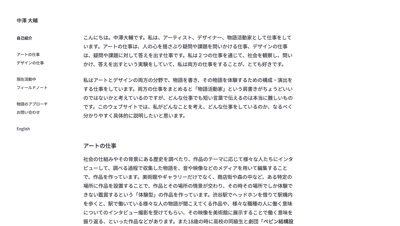 2013年まで沖縄にてキュレーターとして活動し、個展やアートイベントなどに関わる。 その後、マークアップエンジニアとして2年間の制作業務を経験後、2015年にウェブデザイナーとして独立。2020年6月にペンネ株式会社を設立した。 アーティストのポートフォリオサイト制作や、アートプロジェクト系サイトのプロデュースなどを担当している。