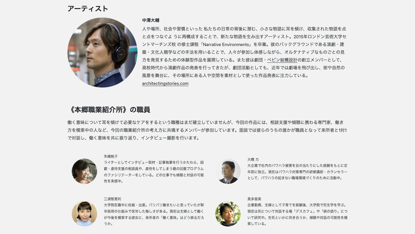 TOKAS本郷で開催された参加型作品「本郷職業紹介所」のオンライン体験プラットフォームを開発し、来場者が自身のインタビュー記録を安全に振り返れる環境を整えました。